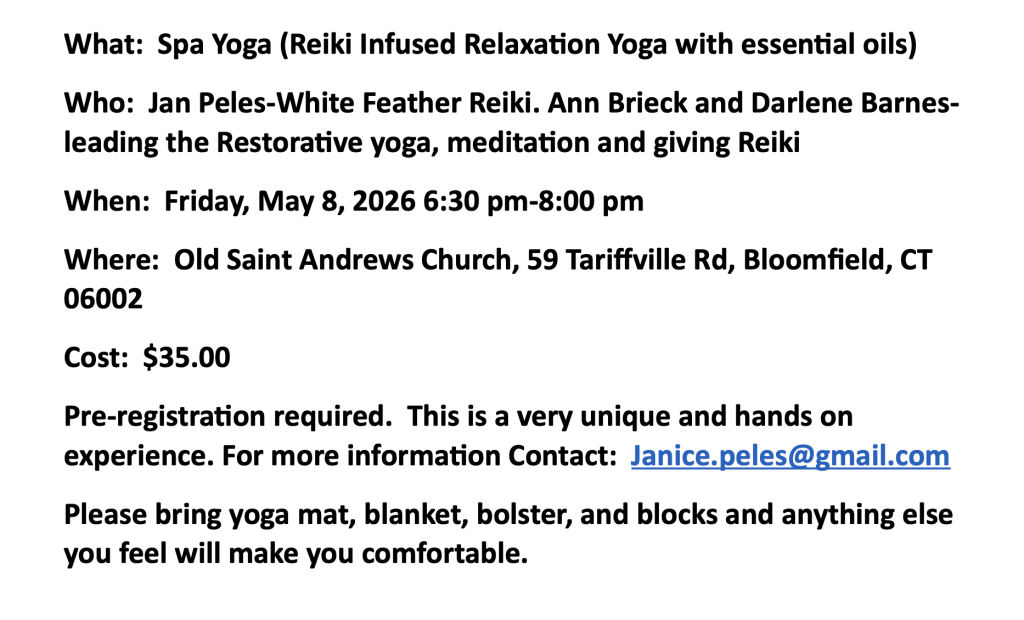 Event runs from 6:30-8:00 p.m. Reiki infused relaxation Yoga with essential oils